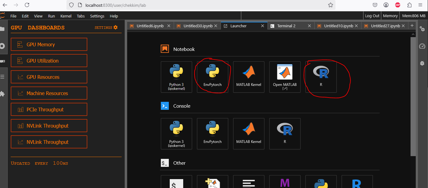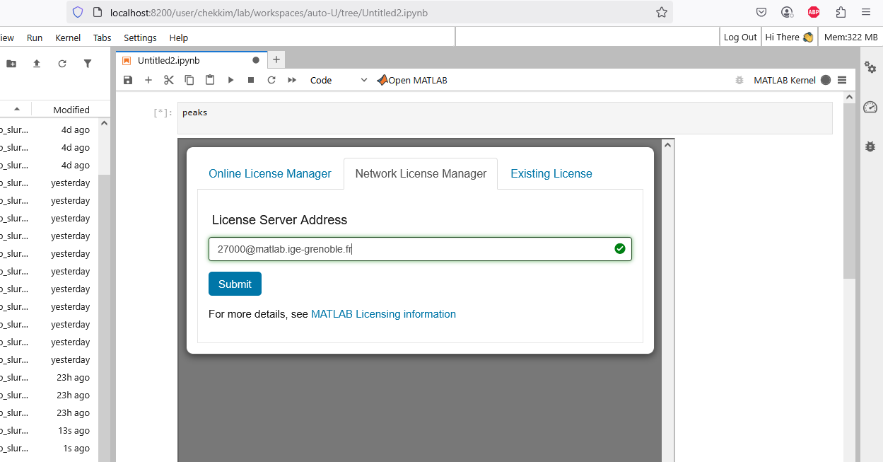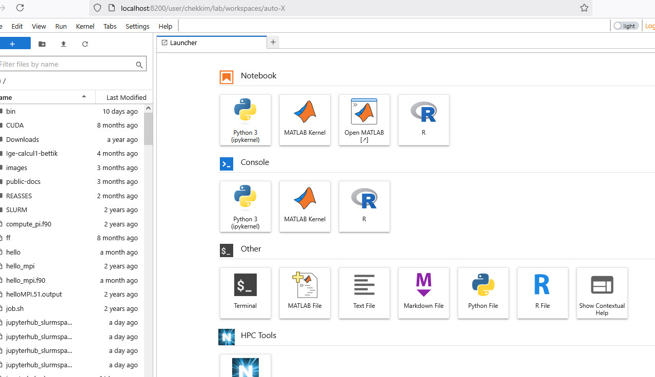 Finally you are connected to the a job and have acces to different kernels (pre-built: Matlab +your own : R/…)