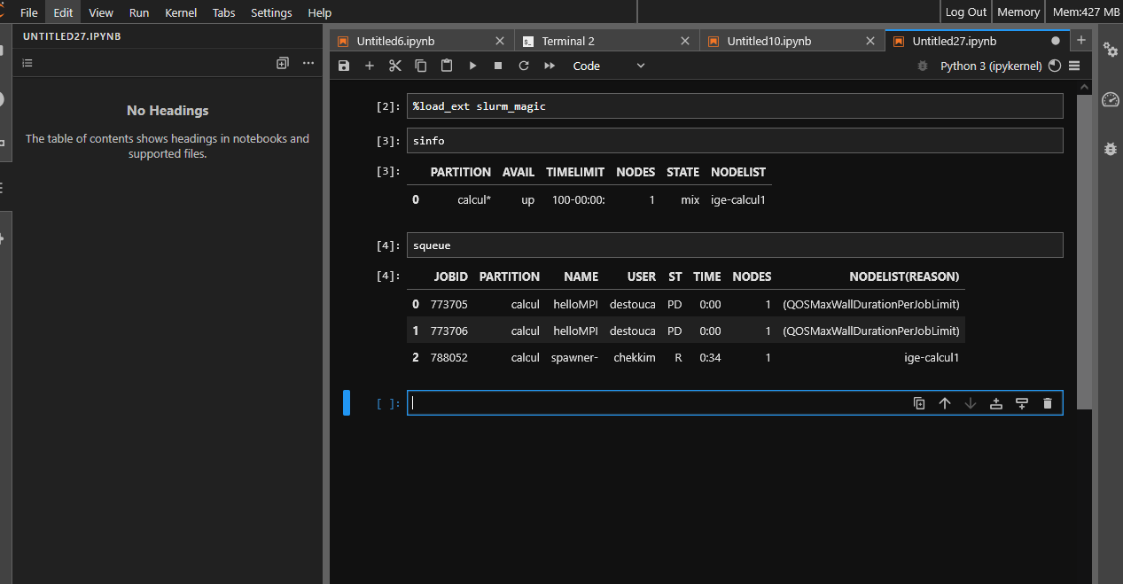 You can acces to slurm commands to check the status of your code, from a notebook